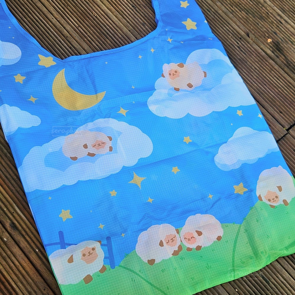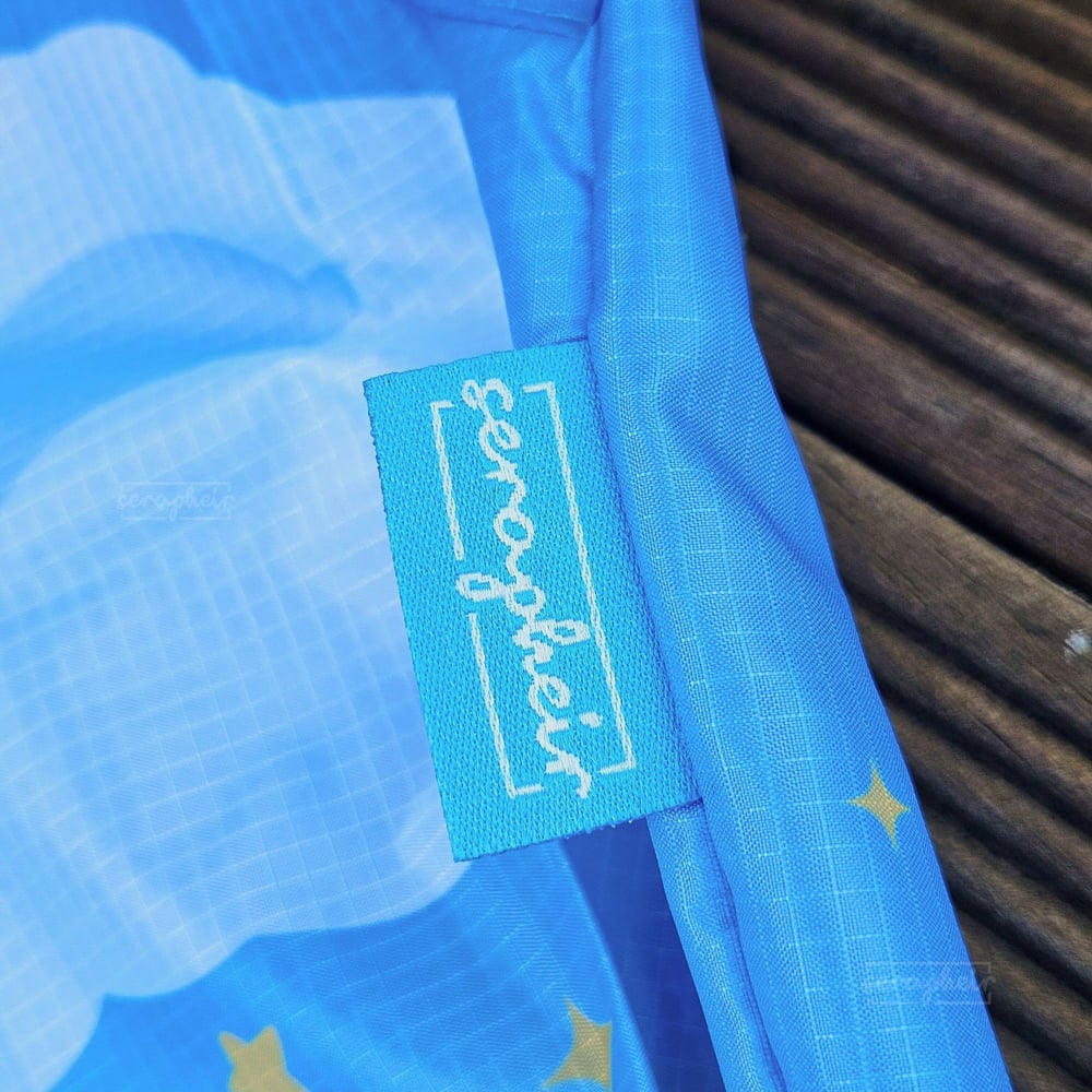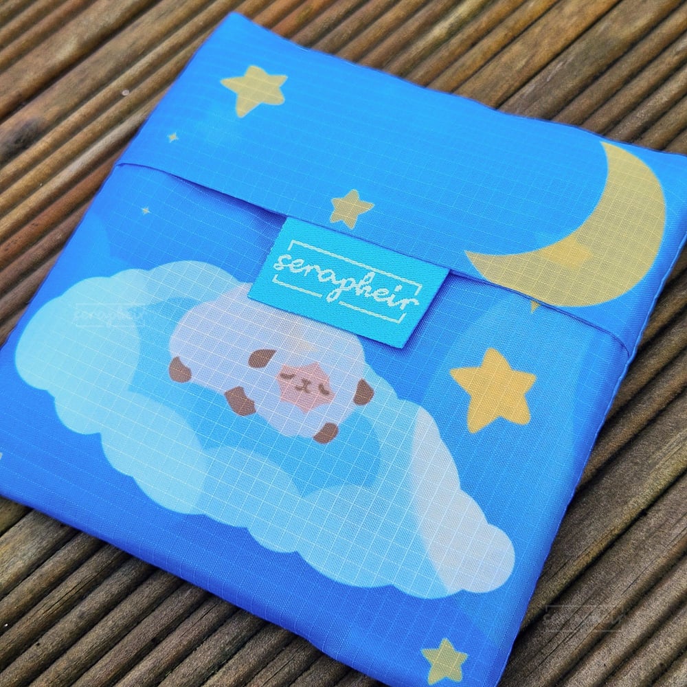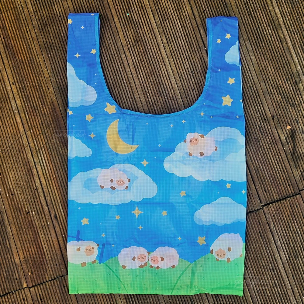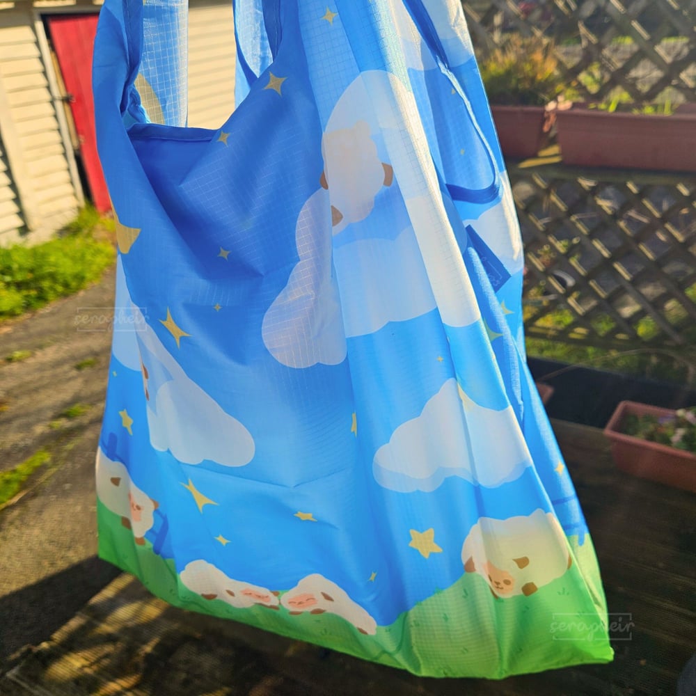 A handy, eco-friendly, reusable shopping bag featuring an original design! The bag folds into a convenient 13x13cm pouch (which is sewn into the bag so you won't lose it!) for easy transport, and is made out of sturdy ripstop nylon. The bag when folded out measures 39cm wide and 64cm long (including handles).