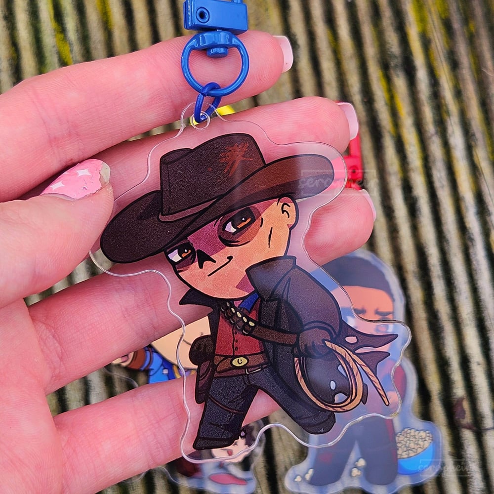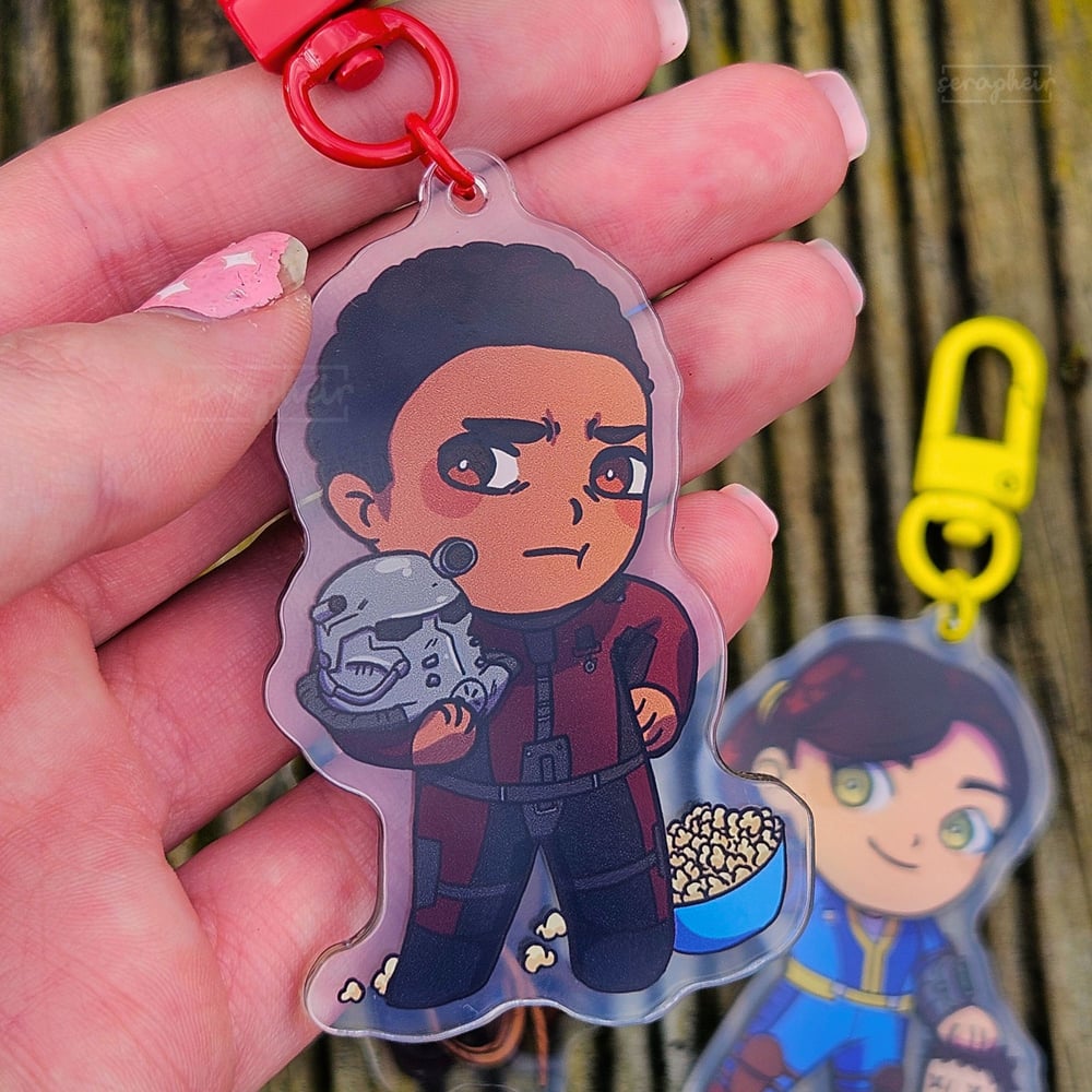 Acrylic charms featuring Lucy, Cooper, and Maximus from the Fallout TV series!