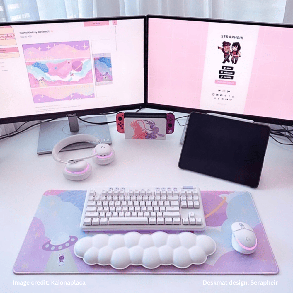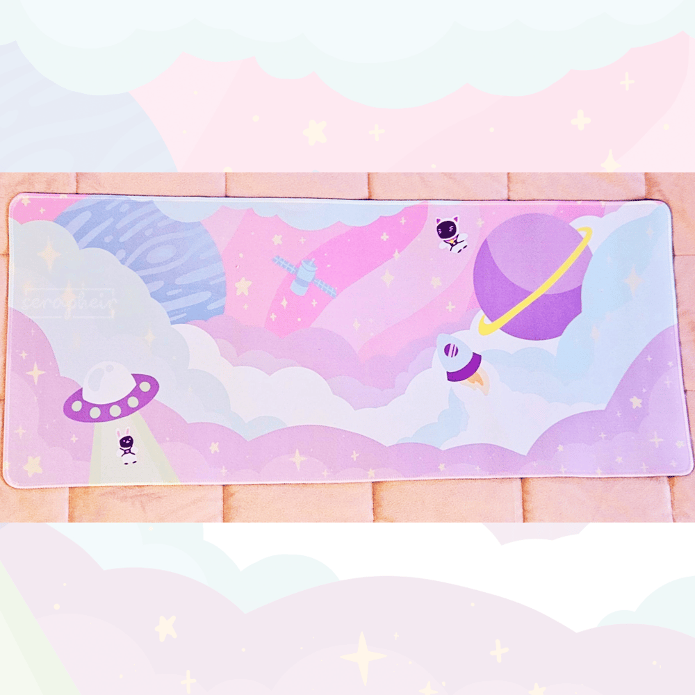 Deskmats measure 70 x 30cm, roughly 2mm thick, stitched edges, and a black rubber mat underneath.