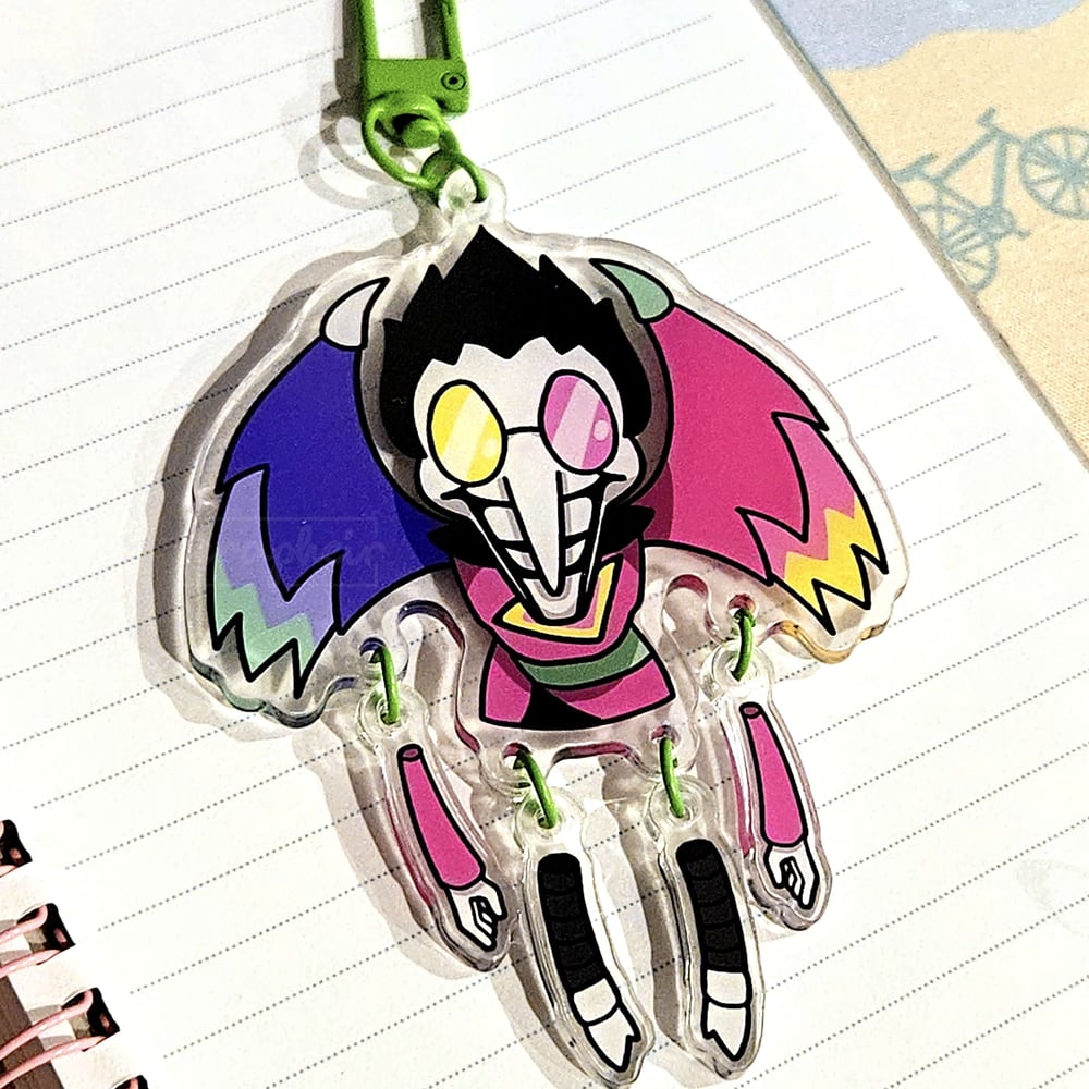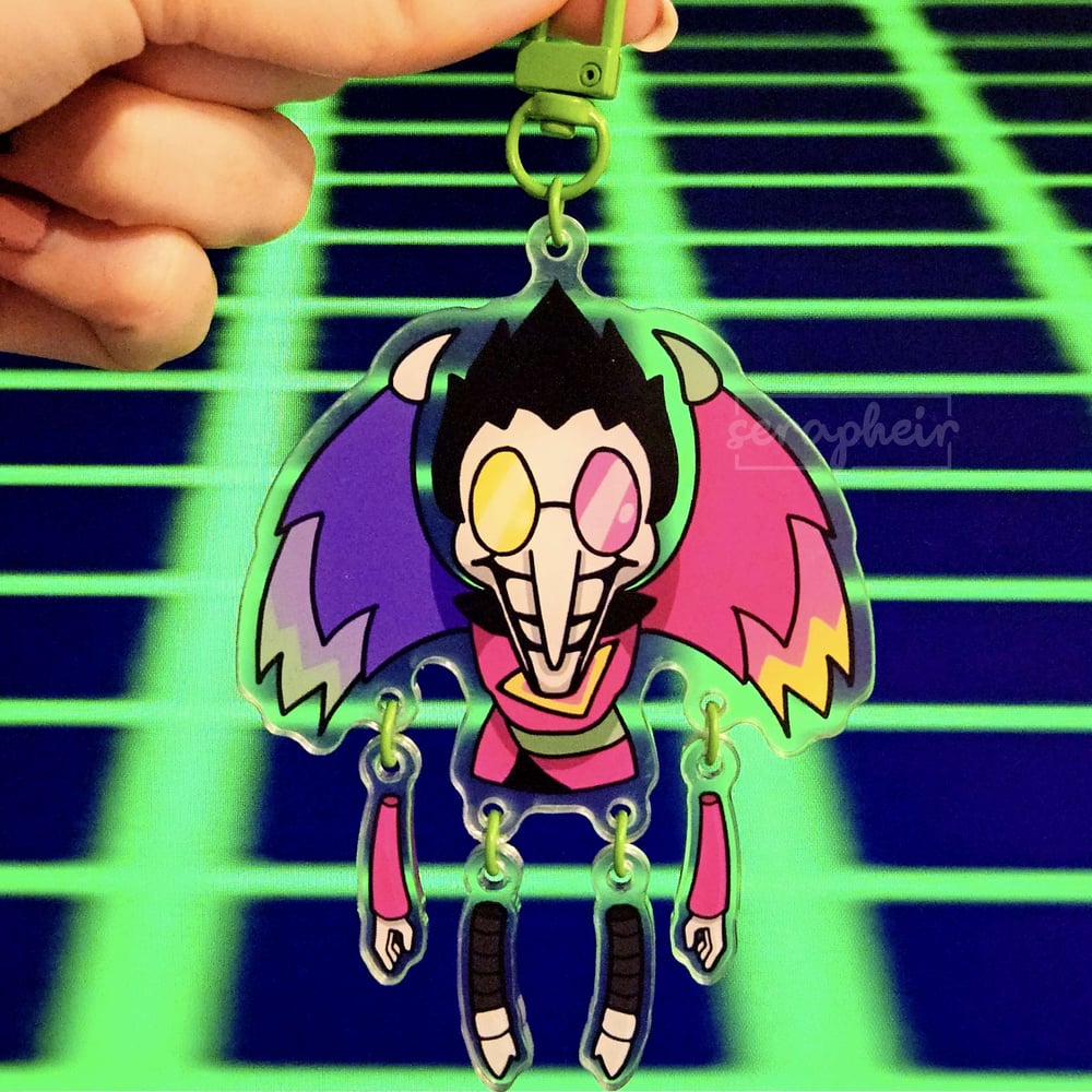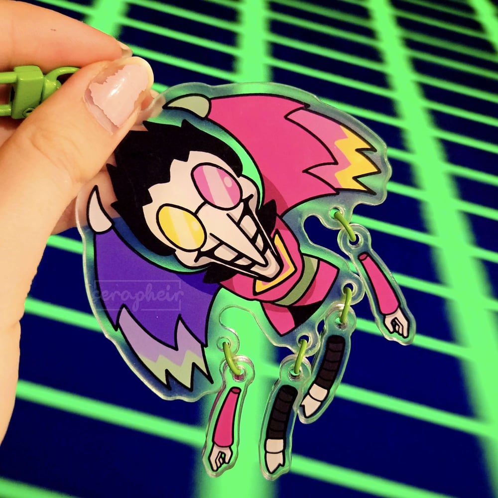 A multi-tiered acrylic charm with green clasp + rings of Spamton NEO from Deltarune!