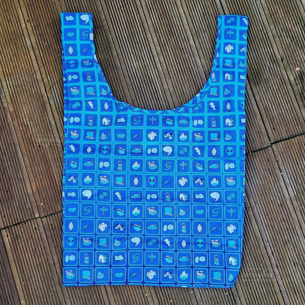 A handy, eco-friendly, reusable shopping bag featuring an original design! The bag folds into a convenient 13x13cm pouch (which is sewn into the bag so you won't lose it!) for easy transport, and is made out of sturdy ripstop nylon. The bag when folded out measures 39cm wide and 64cm long (including handles).